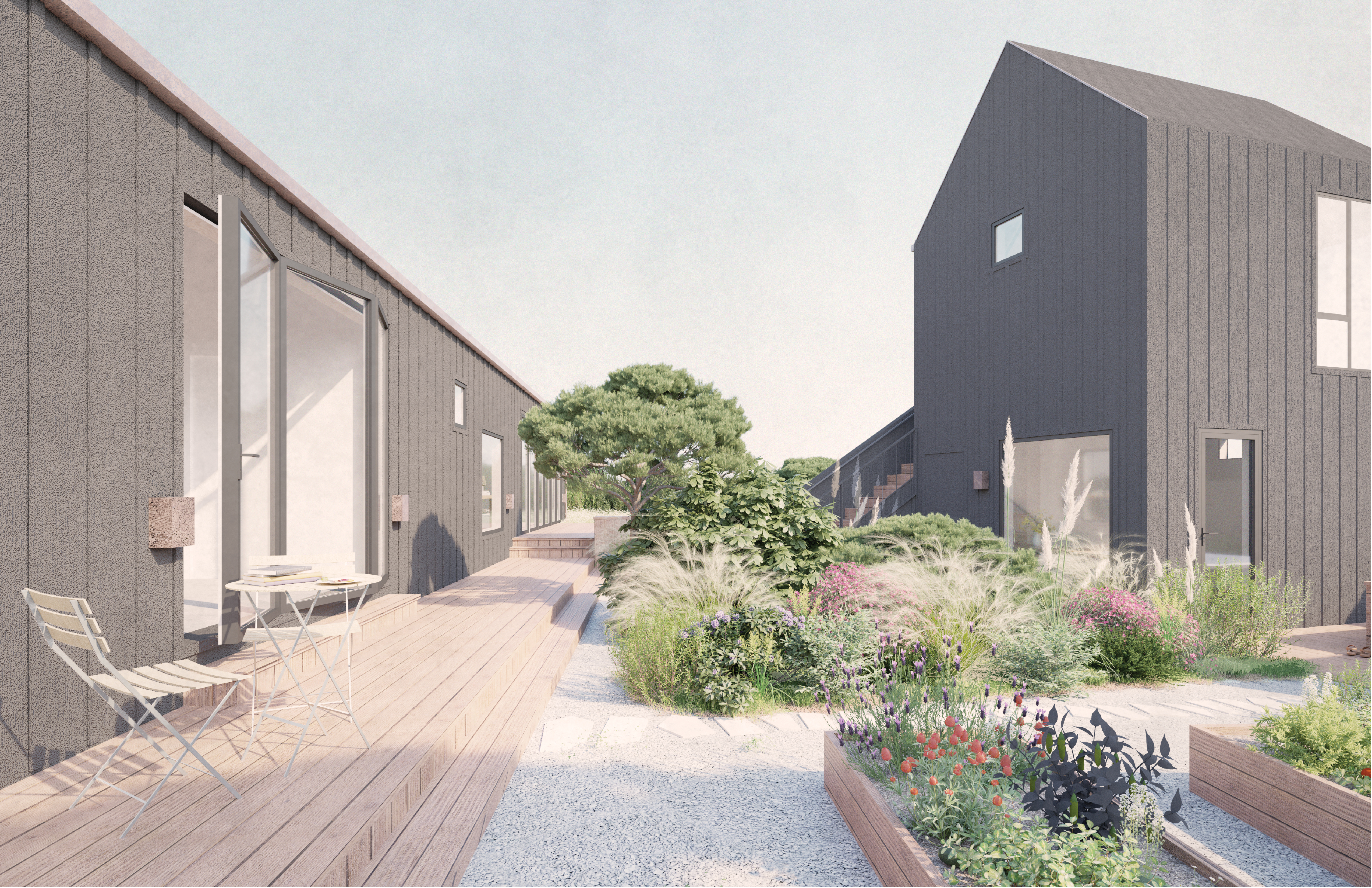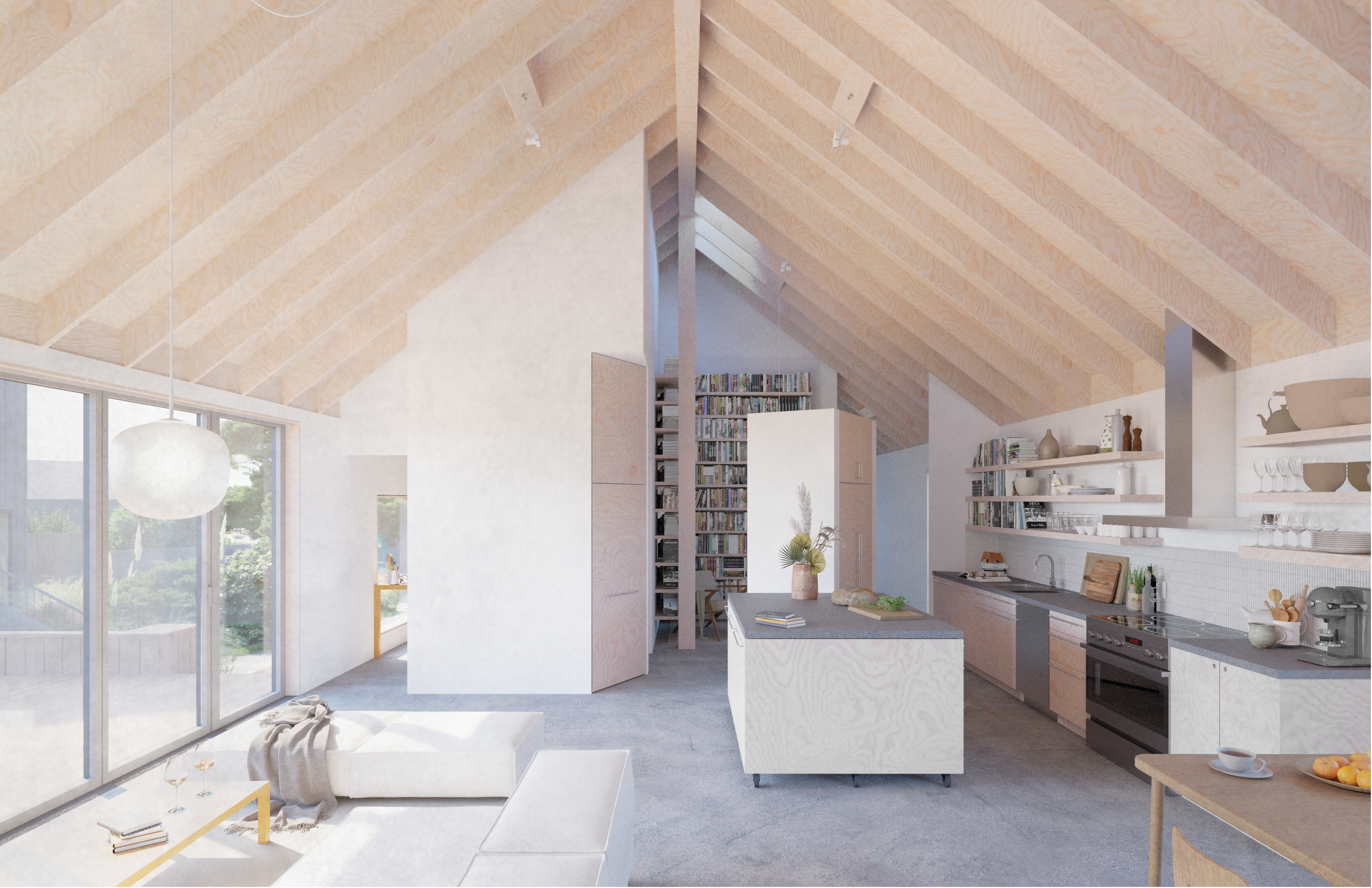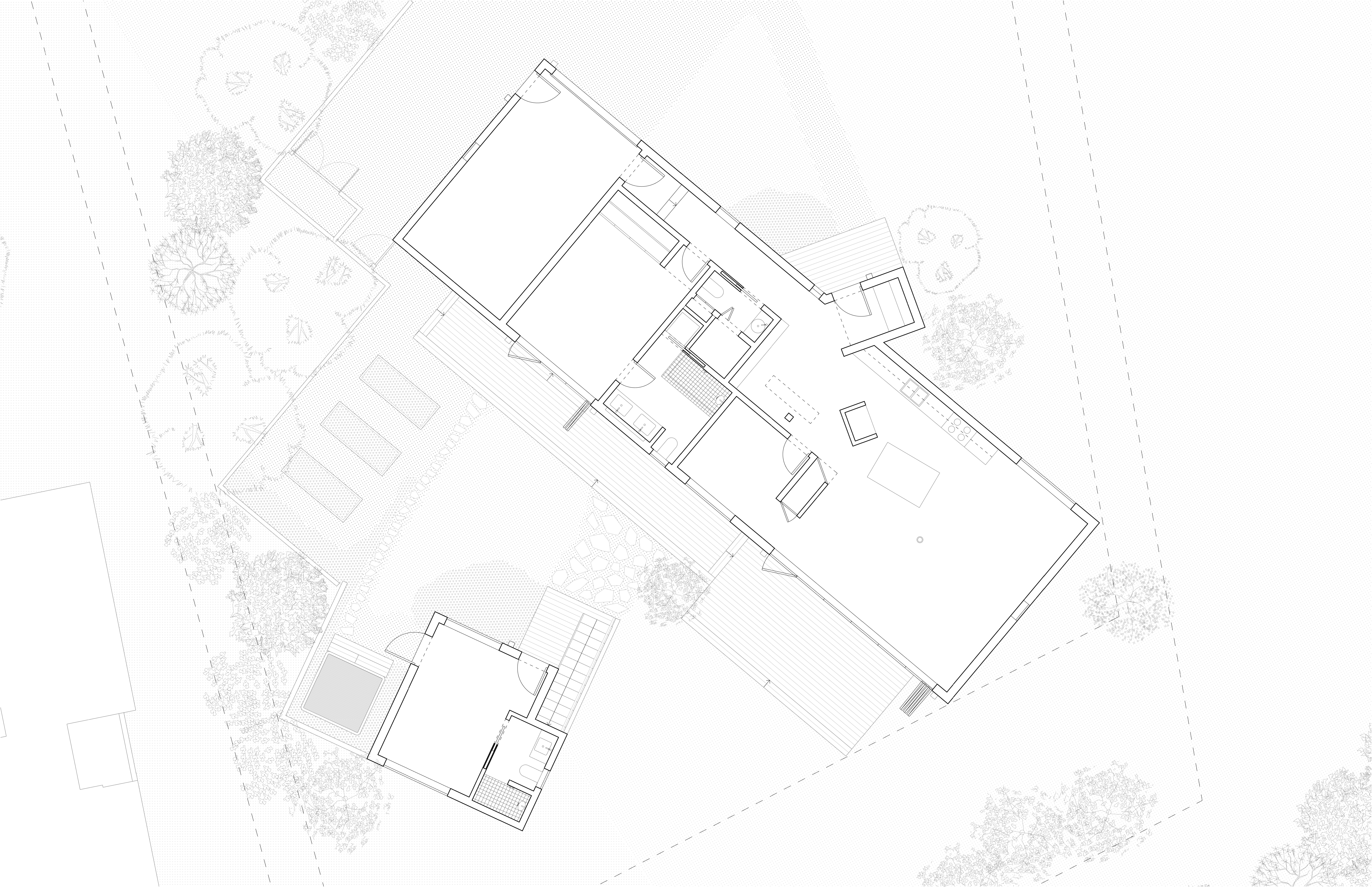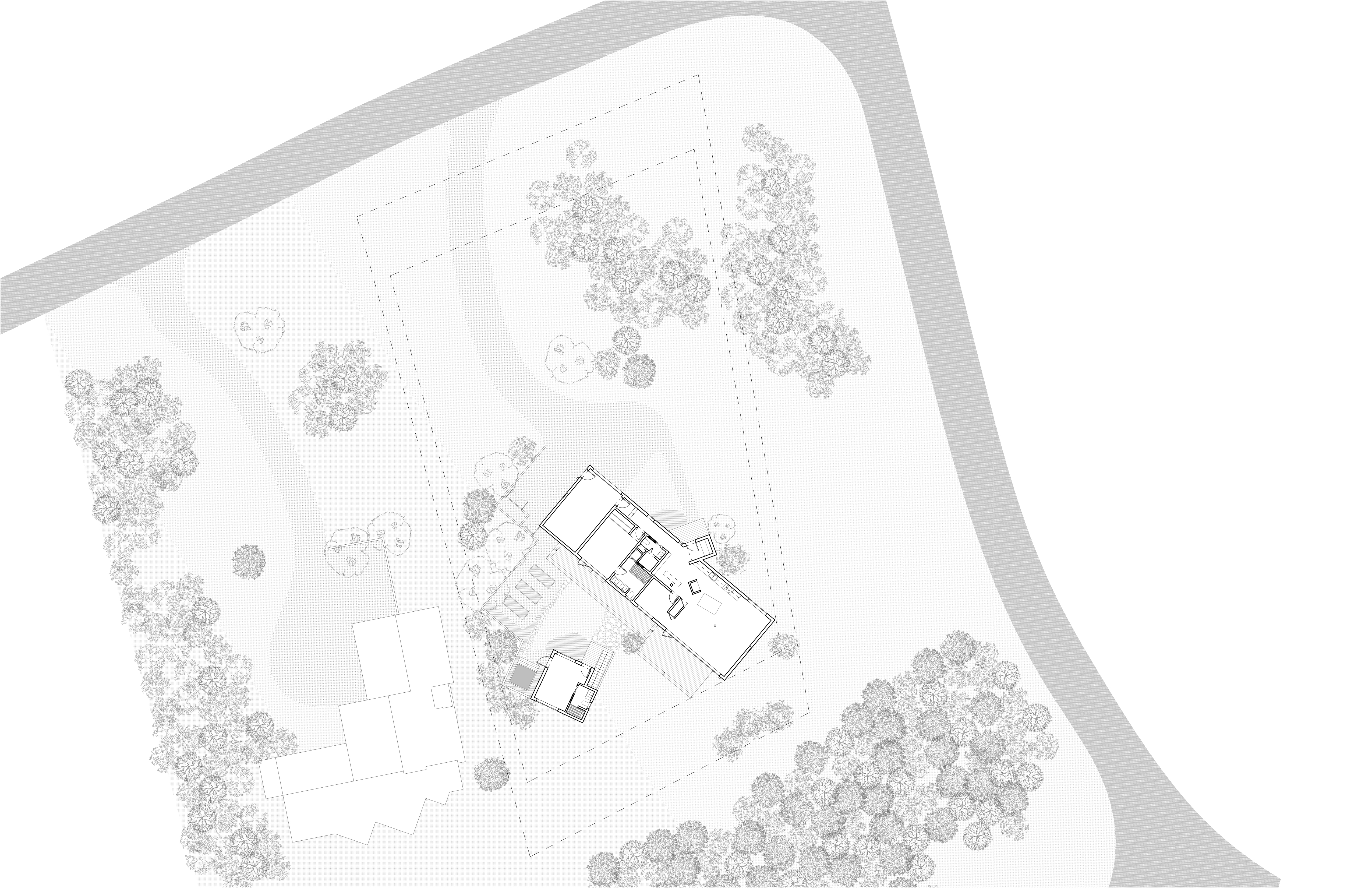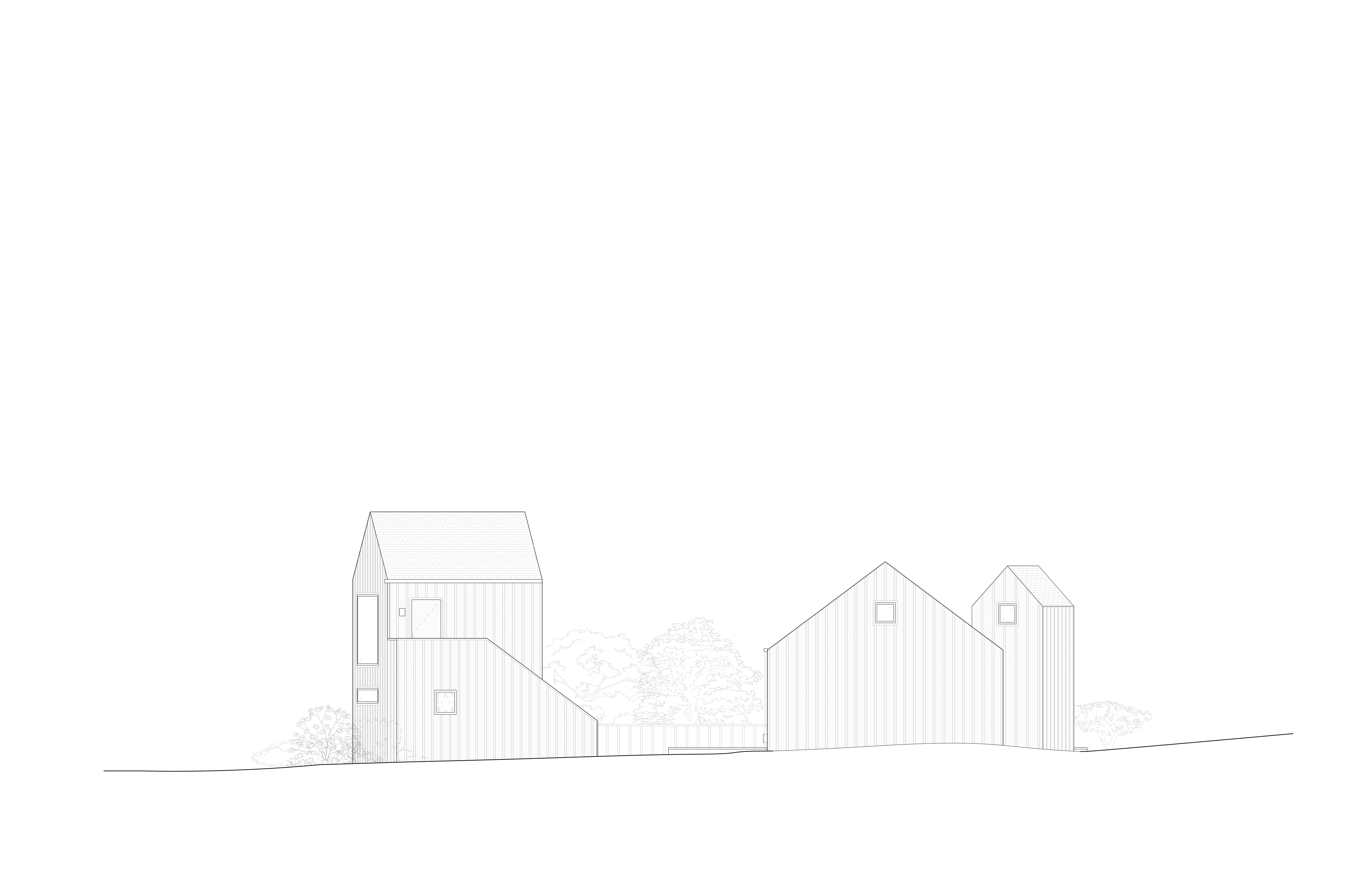 THREE PITCHED ROOFS IN DIALOGUE: Situated along the Northern California coast, Sea Ranch is known for its strong design principles derived from observations of the ecological systems it is situated in. The Long House and the Tall House are together a single family home that emphasize the space between the buildings as much as the buildings themselves. So doing, they bring living into contact with the prairie, coastal forest, and ocean that lie adjacent. It is derived from the considerations of sequence, scale, and the traditional barn form.
